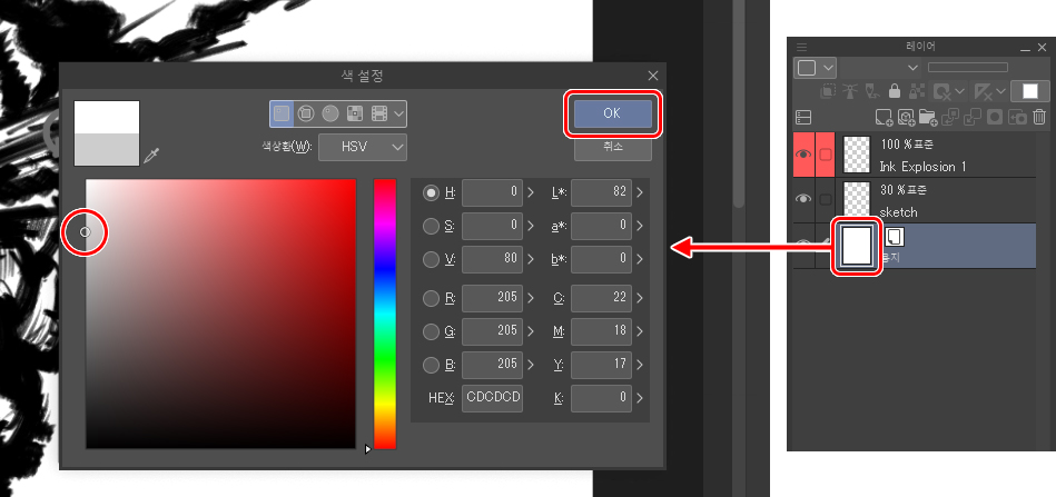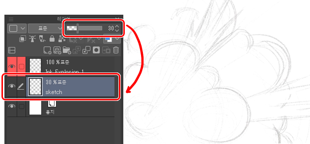 스케치 선이 너무 굵거나 산만하다면 레이어의 불투명도를 낮춥니다.