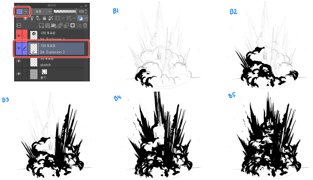 두 번째 폭발도 위와 마찬가지로 그립니다. 새 레이어를 만들어 Ink Explosion 2(폭발_펜 터치 2)로 이름을 정하고 파란색으로 변경합니다.