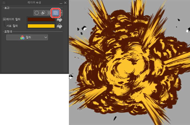 색을 적용하려면 먼저 레이어 속성 팔레트의 레이어 컬러 버튼(기본적으로 오른쪽에 있음)을 누릅니다. 이번에는 주조색으로 진한 갈색(# 511900)을, 보조색으로 노란색 (# FFC21C)을 설정했습니다.