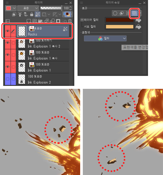 두 번째 폭발에 4(채색) 및 5(흐리기) 단계를 진행합니다.