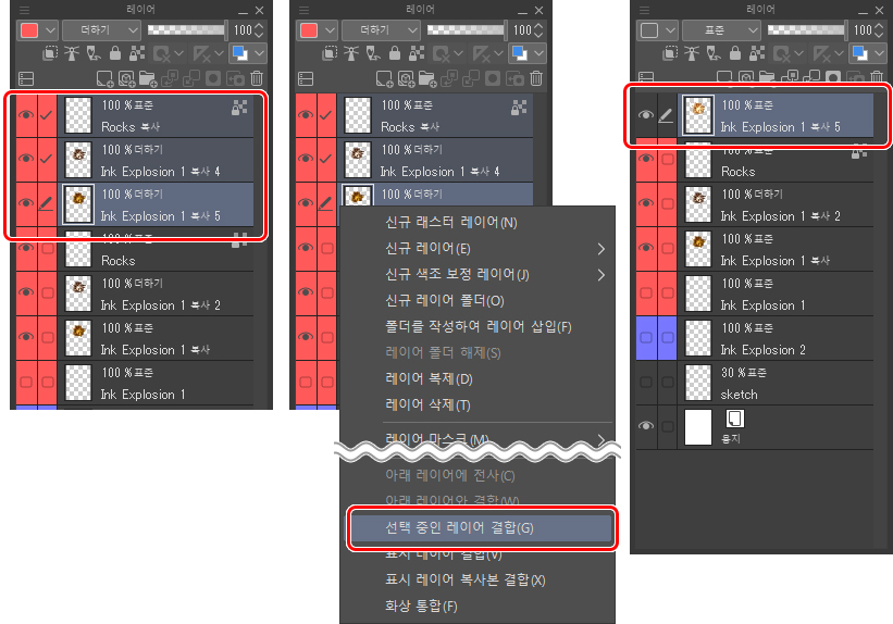 Ink Explosion 1과 White Base 레이어를 결합하여 펜 터치를 마칩니다. 두 레이어를 모두 선택하고 마우스 오른쪽 버튼을 클릭하여 팝업 메뉴에서 선택 중인 레이어 결합을 선택합니다. 결합한 레이어에서 흑백 디테일을 추가하여 폭발의 부피를 완성합니다.