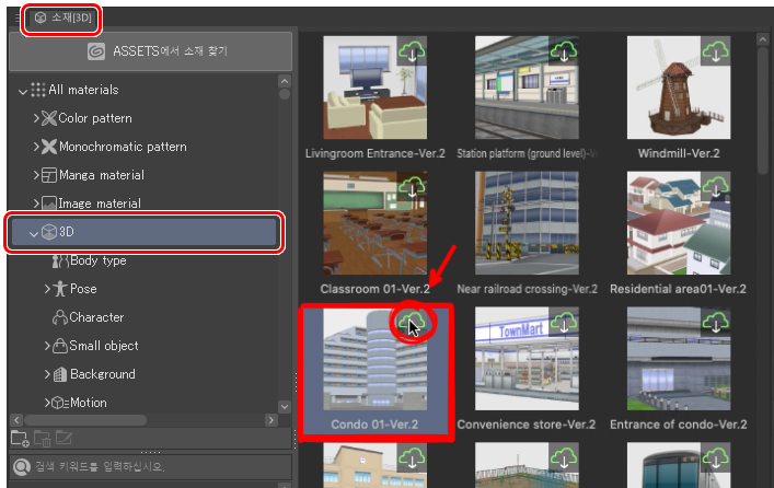 소재(3D) 팔레트로 이동하여 CLIP STUDIO 소재를 검색한 후 마음에 드는 장면을 선택하고 클릭하면 무료로 다운로드할 수 있습니다.