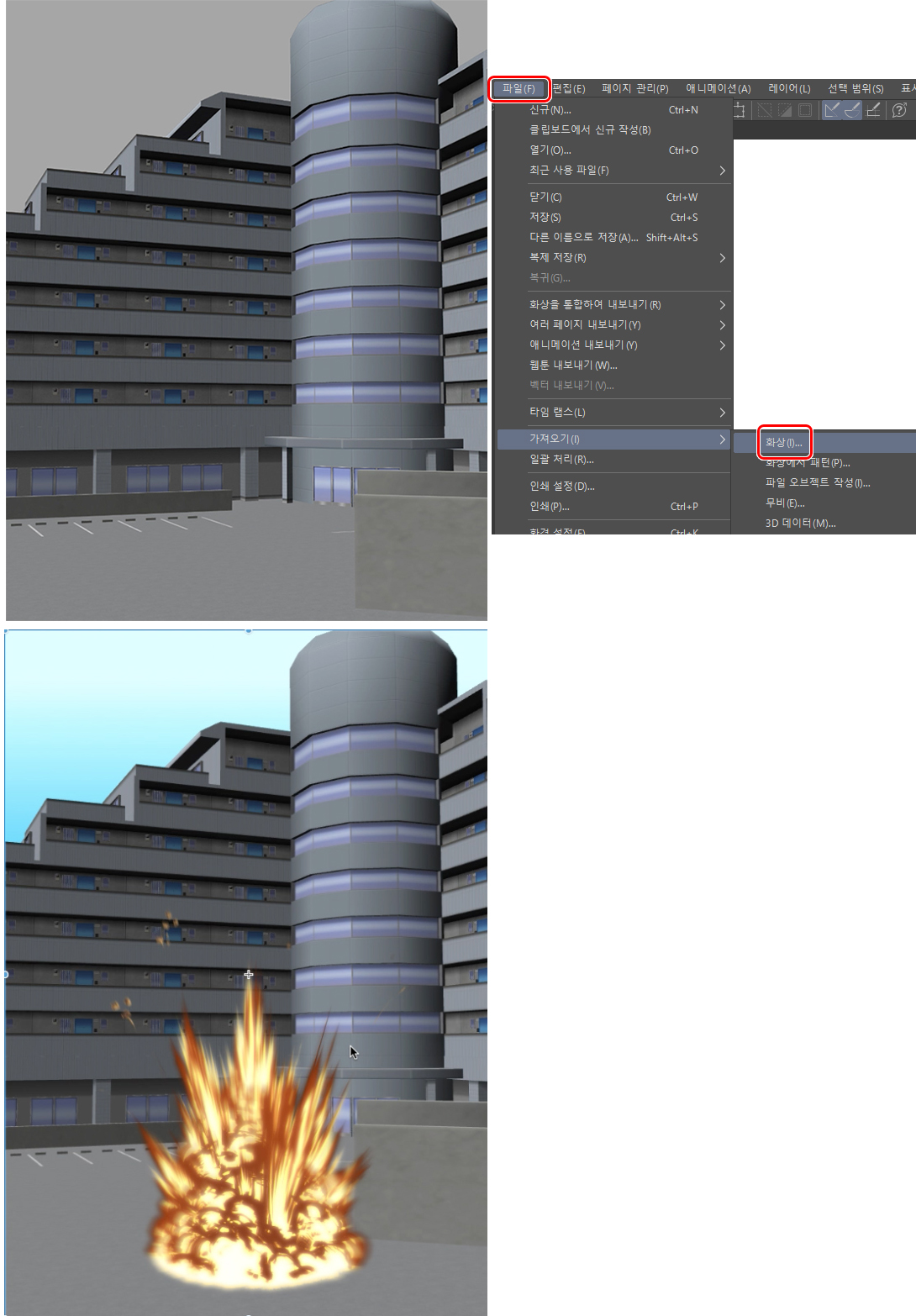 원하는 관점에 환경을 배치하고 이전에 저장한 폭발 PNG를 가져옵니다(편집 > 가져오기).