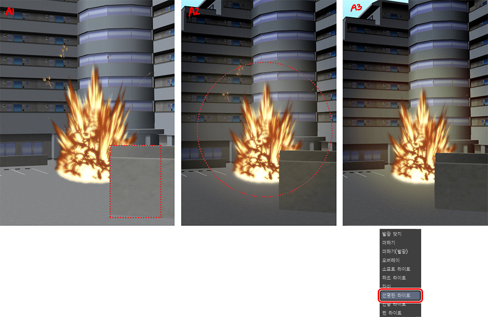 이번에는 주차장 안에 배치했습니다. 전면 벽(A1) 뒤에 가려진 폭발 부분을 지웠습니다. 새로운 레이어에서 실제 불처럼 보이도록 부드러운 에어브러시 도구(A2)로 약간의 광채를 더했습니다. 그 후 레이어 합성 모드를 선명한 라이트(A3)로 변경했습니다.