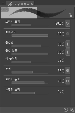 제가 사용하는 브러시는 몇 년 전에 다운로드하여 쓰기 편한 설정이 될 때까지 수정한 오일 브러시입니다. 여러분께 맞는 브러시를 찾아 수정하는 것이 좋습니다만, 특정한 스타일에 접근하기 위해 명심해야 할 브러시와 종류와 설정을 보여드리겠습니다. 제가 사용하는 브러시는 직접 만든 것이 아니므로 CLIP STUDIO ASSETS에서 유사한 브러시를 찾는 것이 좋습니다.