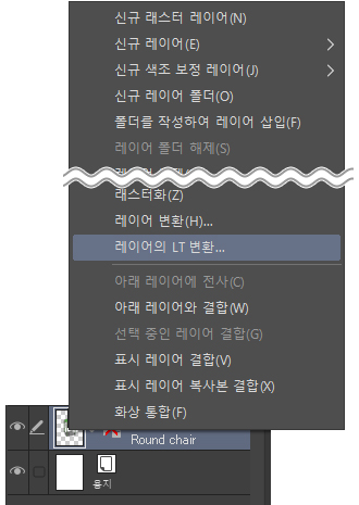 - 3D 오브젝트 레이어를 마우스 오른쪽 버튼으로 클릭하고 레이어의 LT 변환을 선택합니다.