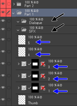 특수 효과와 말풍선용으로 폴더를 추가합니다. 각 폴더에는 30개 이상의 컷이 있을 수 있으므로 구분해야 합니다. 작업 중인 컷 번호를 사용하는 것과 같은 방식으로 레이어 이름을 지정합니다.