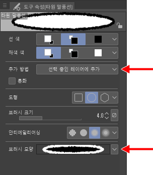 ‘브러시 모양’으로 풍선에 다른 모양을 추가할 수 있습니다. 여기 스타일에 어울려서 ‘스프레이’를 선택했습니다. 다음은 스프레이 브러시 모양과 펜 브러시 모양을 비교한 예입니다.