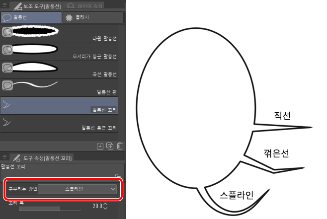 풍선에 알맞는 말풍선 꼬리를 선택합니다. 저는 항상 스플라인을 선호합니다.