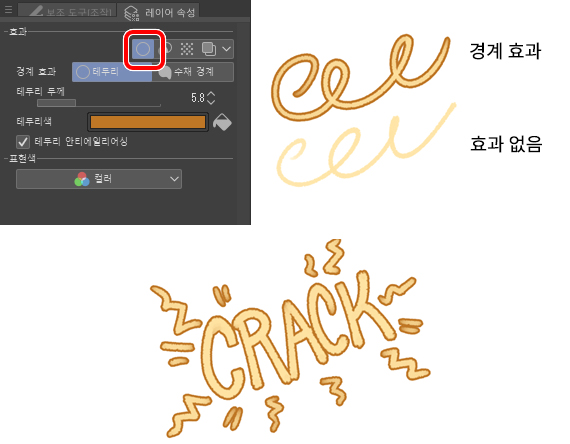 ‘레이어 속성’ 팔레트에서 ‘경계 효과’를 선택하여 윤곽선의 굵기와 색을 설정할 수 있습니다.