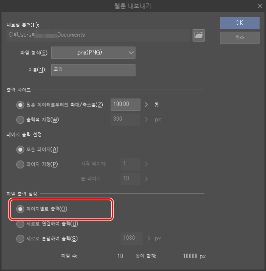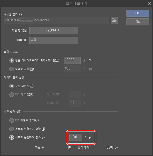 분할해서 작업할 수 있는데 왜 긴 캔버스로 작업했는지 궁금할 텐데요. 컷 테두리 없는 컷을 만들려면 캔버스 전체에 많은 공간을 사용하기 때문에 처음부터 분할할 수 없습니다. 고맙게도 처음에 웹툰 형식을 선택했을 때만 활성화되는 ‘웹툰 내보내기’라는 옵션이 있습니다.