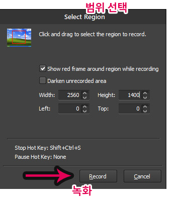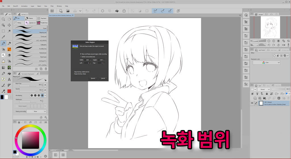 예시 강좌에서 CLIP STUDIO PAINT 창 영역을 선택하고 녹화 버튼을 클릭하여 녹화를 시작합니다.