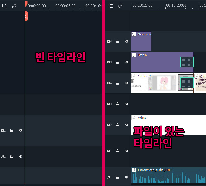 대부분의 동영상 편집 프로그램은 이미지, 동영상 및 오디오 파일을 추가하는 타임라인에서 작업합니다. 이미지나 사운드가 겹치도록 타임라인에 동영상 또는 오디오 파일의 레이어/트랙이 두 개 이상 있을 수 있습니다(예: 타임라인의 한 레이어에서 음악을 재생하는 오디오 파일이 있고 특정 부분에서 사운드를 재생하려면 다른 사운드 레이어에 추가하여 음악이 사운드 재생을 위해 멈추지 않도록 해야 합니다).