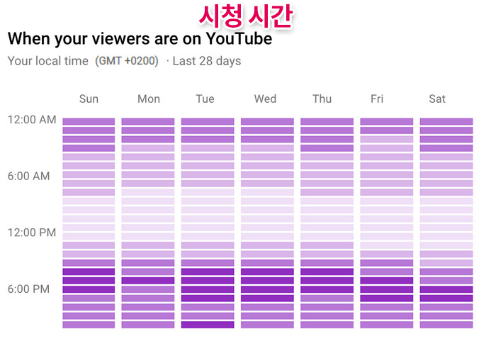 – 일정: 동영상이 라이브로 전송될 특정 날짜와 시간을 결정할 수 있습니다. 처음 업로드하는 동영상이 아닌 경우 유튜브 스튜디오에서 시청자의 활동 시간과 요일에 대한 몇 가지 통계를 볼 수 있습니다. 이를 활용하면 가능한 한 많은 사람들이 볼 수 있도록 동영상 공개 시점을 정할 수 있습니다. 색이 어두운 지점일수록 더 많은 시청자가 활동하고 있음을 나타냅니다.