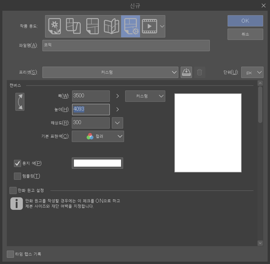 그럼 새로운 파일을 만들어 보겠습니다. 이는 제가 일반적으로 시작하는 설정인데 오늘 작업할 그림에 사용할 것입니다. 먼저 환경 설정을 살펴본 다음 단축키에 대해 설명하겠습니다.