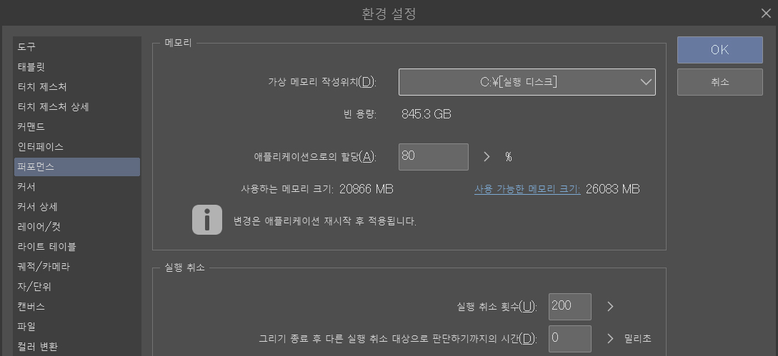 환경 설정에서 여유 공간과 앱에 할당된 메모리 양을 확인할 수 있습니다