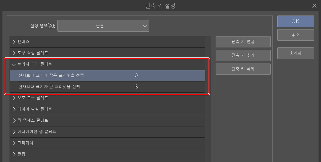 브러시 크기 팔레트 옵션과 팝업 팔레트에서 브러시 크기를 변경하는 단축키와 같은 몇 가지 단축키에 대해 설명하겠습니다.