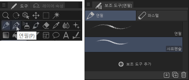 다음 줄에는 연필 , 펜, 에어브러시 및 브러시 도구가 있습니다. 이는 모두 그리기 도구입니다.