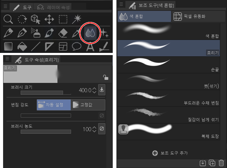 색 혼합 도구, 특히 색 혼합 보조 도구에 있는 흐리기는 CLIP STUDIO PAINT에서 가장 좋아하는 도구입니다. 펜을 누르는 힘에 따라 흐림 강도를 높여 부드러운 가장자리를 잘 만들 수 있습니다.