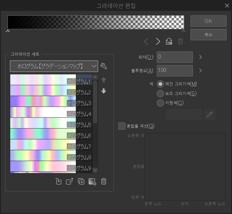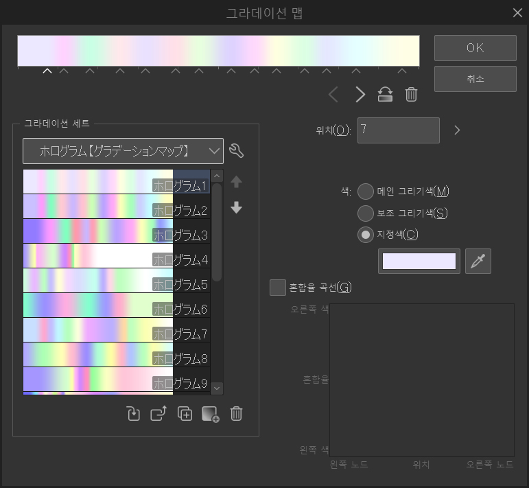 다음은 그라데이션 맵입니다. 이를 사용하여 색을 조금 더 통일하는 것을 좋아합니다. 다음은 CLIP STUDIO ASSETS 페이지에서 다운로드한 몇 가지 그라데이션입니다. 일반적으로 멋지게 보이는 것을 찾을 때까지 여러 그라데이션을 사용해 봅니다. 그런 다음 레이어 불투명도를 낮추므로 효과는 그다지 강하지 않습니다.