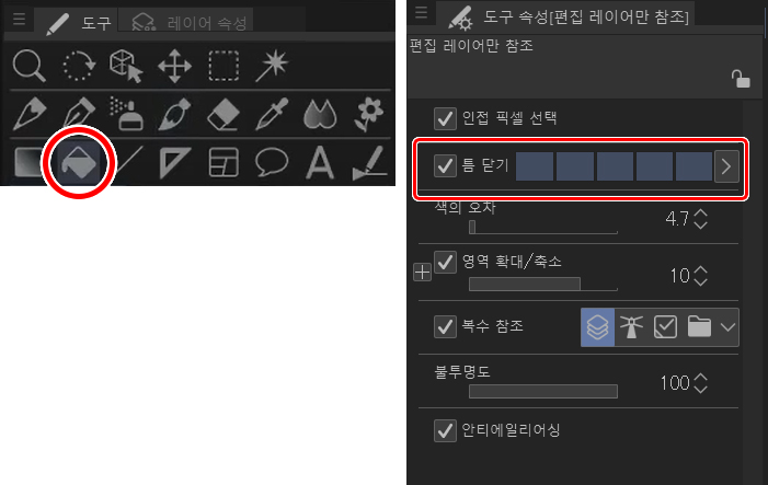 다음은 채우기 도구로 이 또한 제가 좋아합니다. CLIP STUDIO는 선화에 틈이 약간 생긴 경우 그 간격을 좁게 설정하면 선화를 벗어나지 않게 채울 수 있습니다.