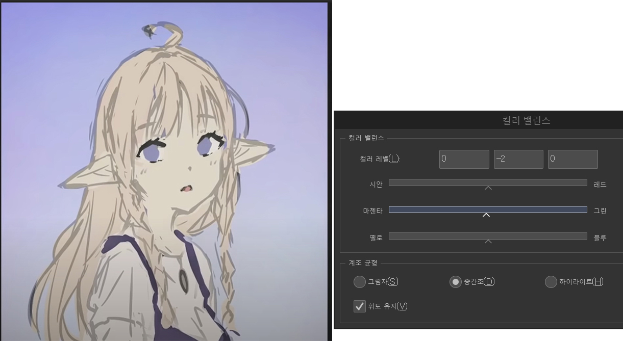 컬러 밸런스 레이어를 사용하여 배경과 더 잘 어울리도록 스케치에 파란색과 자홍색을 추가했습니다.