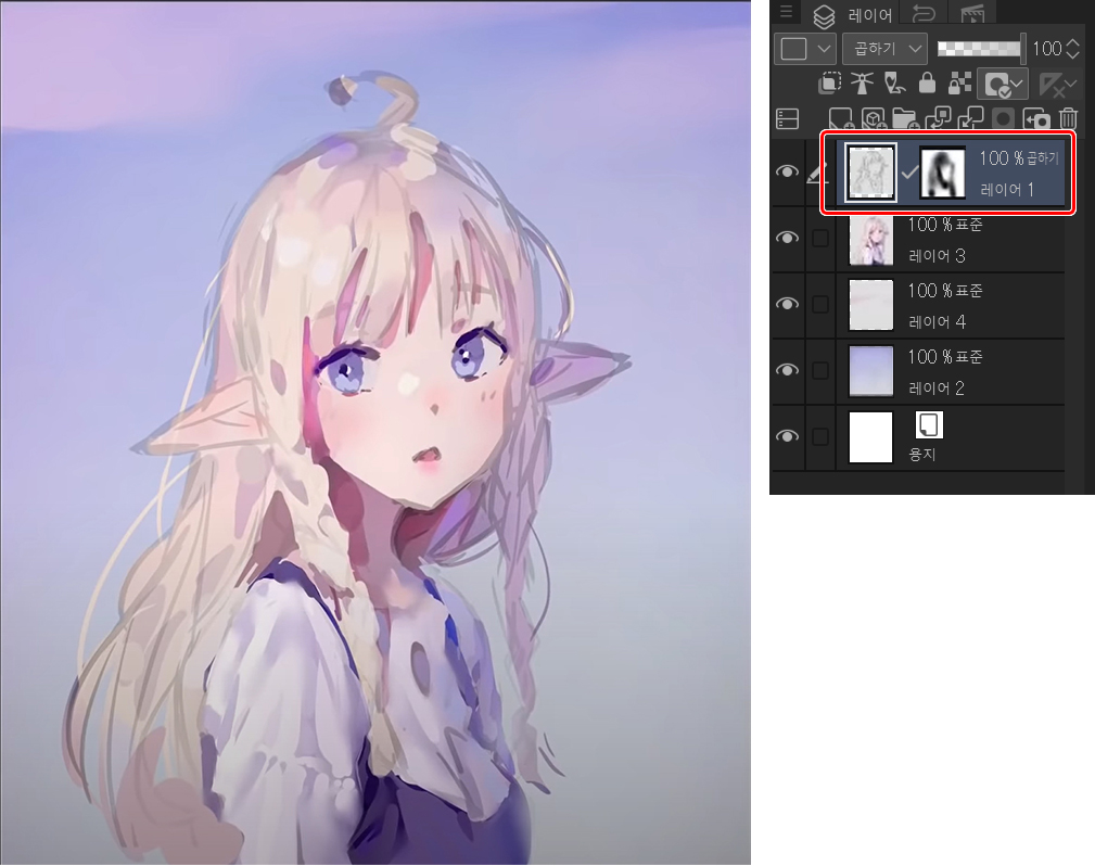 스케치 선 레이어에 마스크를 만들고 에어브러시를 사용하여 너무 강하게 느껴지는 부분을 흐리게 조정합니다. 그런 다음 전체 캐릭터를 결합하여 선과 색이 하나로 합쳐진 레이어 위에서 작업을 시작합니다.