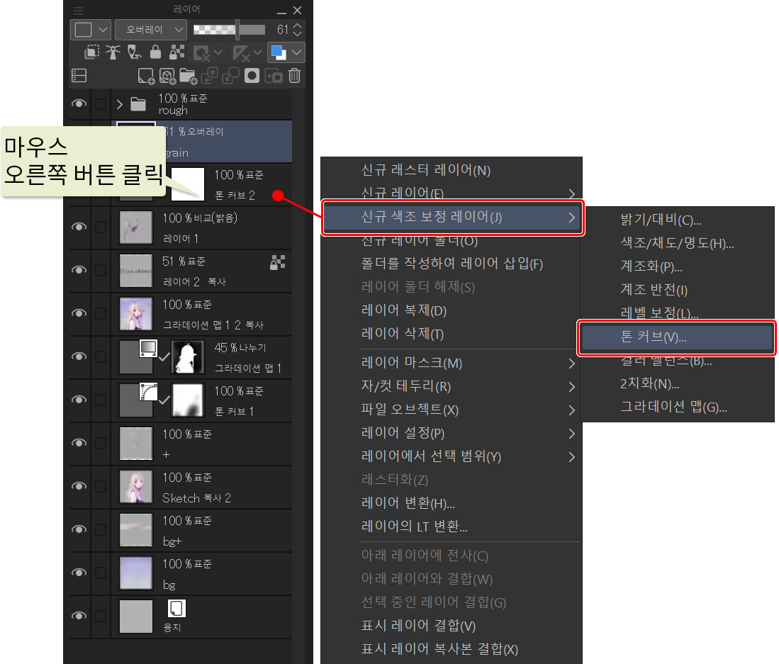캐릭터를 그릴 때 마무리 단계에서 일반적으로 이러한 보정 레이어를 추가해 미세 조정합니다. 앞서 언급했듯이 레이어를 마우스 오른쪽 버튼을 클릭하고 새 보정 레이어를 만든 다음 풀다운 메뉴에서 원하는 보정을 선택하여 보정 레이어를 만들 수 있습니다.
