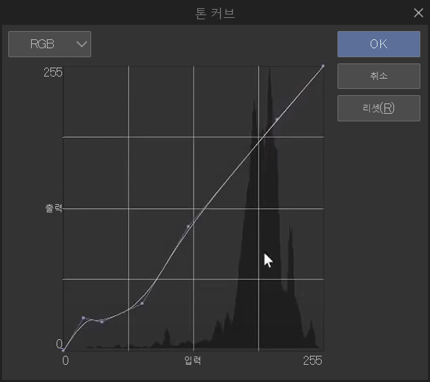 첫 번째 적용할 보정 레이어는 톤 커브입니다. 이를 사용하여 그림을 어둡거나 밝게 조정할 수 있습니다. 0에 가까운 값은 어두운 값이고 다른 쪽 값은 밝은 값입니다. 대비를 높이기 위해 그림의 어두운 부분을 좀 더 어둡게 만들었습니다.