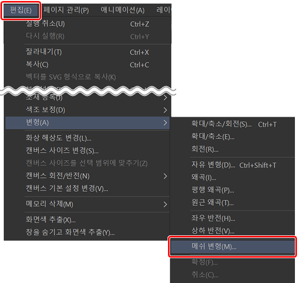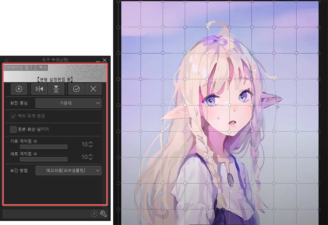 이렇게 하려면 편집 > 변형 > 메쉬 변형을 선택하면 아래 이미지와 같은 격자가 생깁니다.