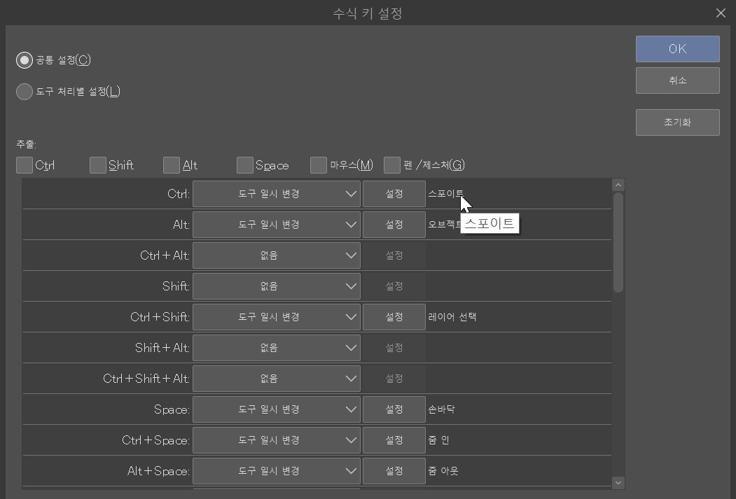 스포이트 단축키를 많이 사용하기 때문에 스포이트와 오브젝트 도구를 ctrl에서 alt로 바꿨고 alt보다 ctrl을 더 누르기 쉬워진 것 같습니다. 아직 모르는 매우 유용한 단축키가 많이 있을 테니 이 메뉴를 살펴보세요.