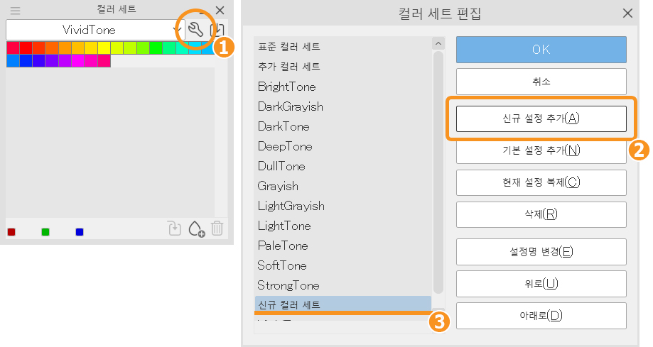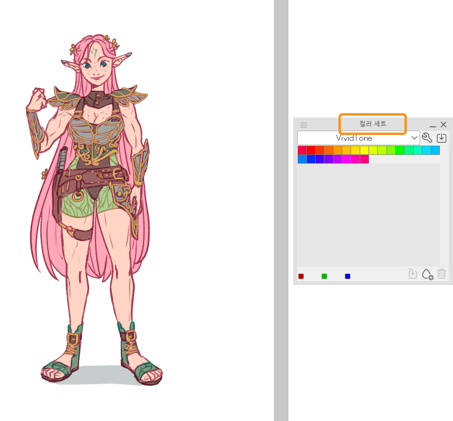 [컬러 세트]라는 창에 기본 컬러 팔레트가 있는데 이를 사용하여 자신만의 컬러 팔레트를 만들 수도 있습니다.