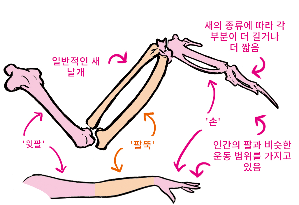 새의 날개 뼈 구조는 사실 인간의 팔 구조와 꽤 유사합니다. 인간의 팔과 비슷한 운동 범위를 가지고 있습니다.
