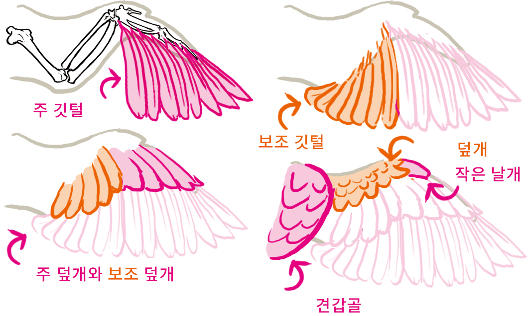 또한 날개가 펄럭일 때 깃털 끝이 주요 동작보다 늦게 움직입니다.