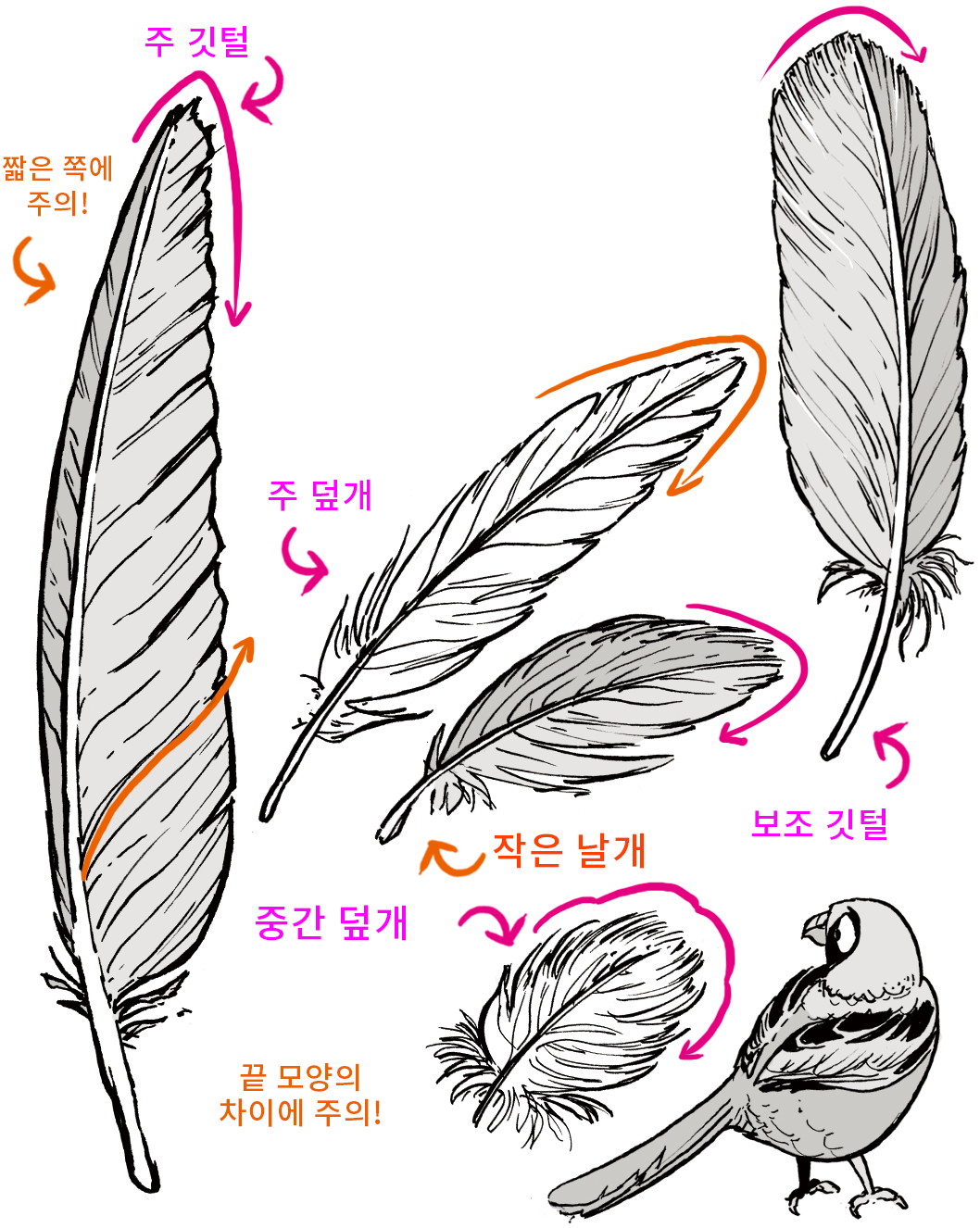 날개에도 다양한 종류의 깃털이 있습니다. 다음은 깃털 그룹에 대한 몇 가지 간단한 모양입니다.