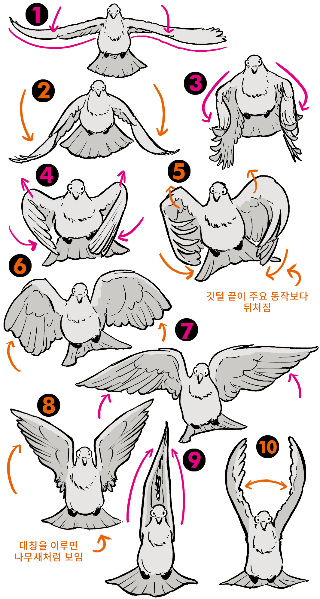 양쪽 날개의 움직임을 완전히 대칭되도록 그리면 좋을 것 같지만 대칭성은 새를 그릴 때 훨씬 더 생동감을 줍니다! 대칭을 이루면 마치 나무로 만든 새를 그린 것처럼 이미지가 정지되어 보입니다.