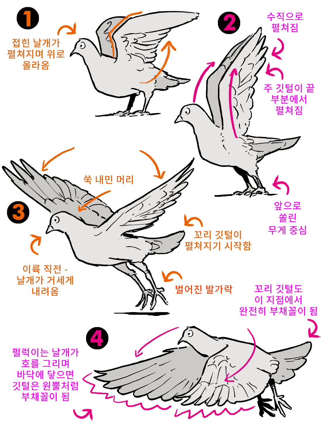 - 자리를 박차고 날아오르기 직전 날개가 거세게 내려오고 머리가 앞으로 기울어지며 꼬리 깃털이 열리기 시작하면서 발가락이 벌어집니다.