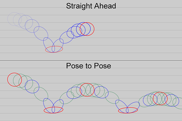 Straight ahead action and pose to pose action are two approaches to animating movement. Straight ahead action refers to animating the frames in consecutive order. This can lead to a more spontaneous and organic feel, but can also be harder to control the framing or proportions.