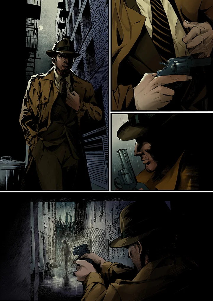 Noir comics are a subgenre of mystery/crime comics that draws inspiration from the “Noir Film”, which was originally a type of black-and-white crime drama style, with cinematic storytelling focused on the high contrast between light and shadows.