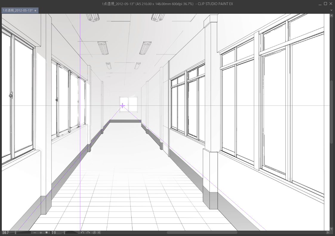 Photo references and 3D models can help you understand how to draw scenes with accurate perspectives. You can also use tools like the perspective ruler in Clip Studio Paint to add a vanishing point and guidelines to help you draw more accurately. When a perspective ruler is set up, brushes and figure tools will snap to the perspective automatically, which makes it ideal for drawing buildings and windows.