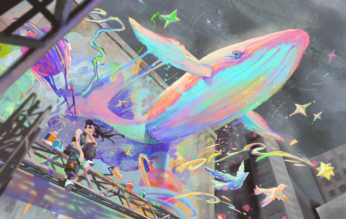 A colorful, gigantic whale springs out from an illustration on the wall with such power. This work fits perfectly with the theme of the contest, "Colorful."