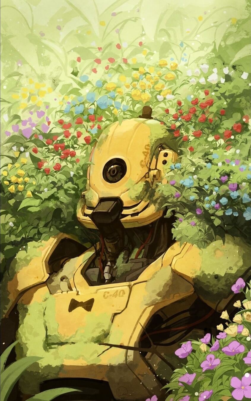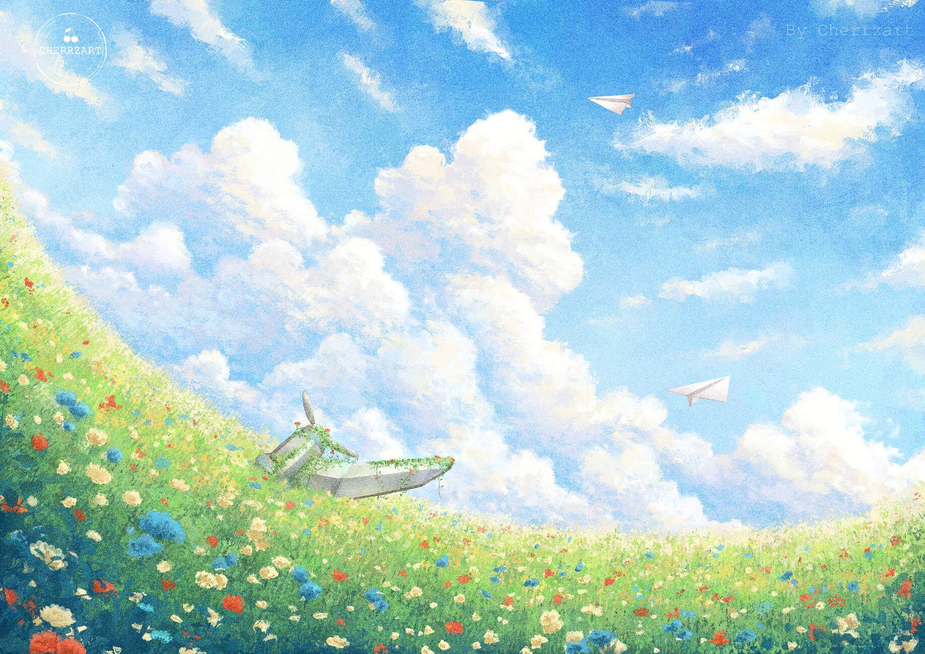 The fisheye perspective of the spacious field and the beautiful blue sky gives the viewer a sense of how grand nature is. With the blue and green colors as the base colors, airplanes and tri-colored flowers accent the scene, showing how the work has been devised down to the smallest detail.