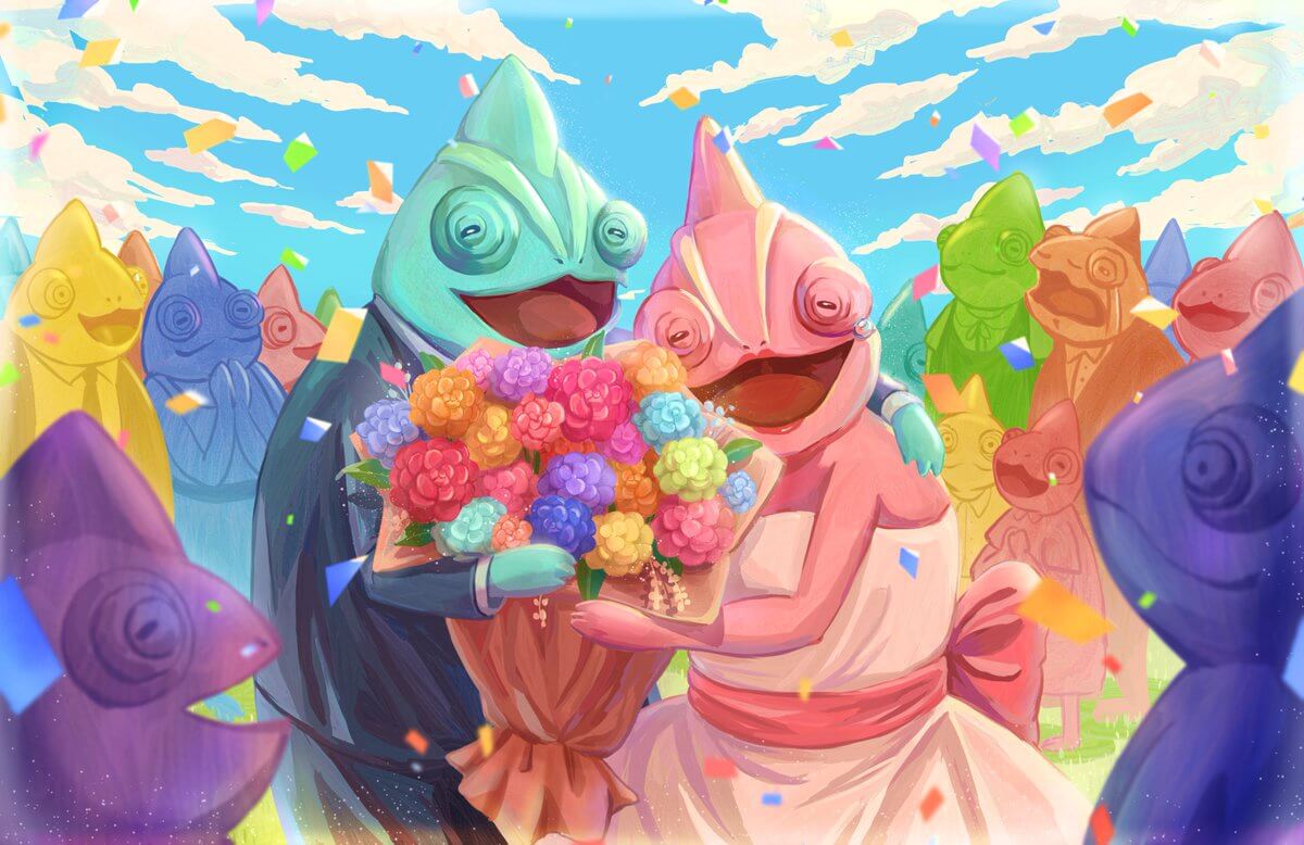 What a lovely scene of a wedding with colorful characters painted in expressive ways. The confetti and bouquets are also colorful, incorporating this work well with the contest’s theme.