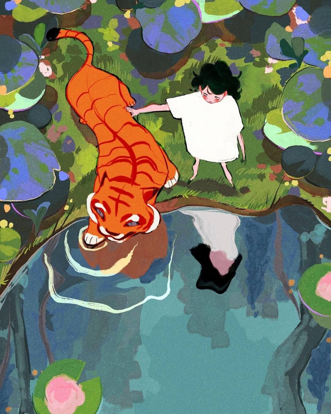 The combination of the girl and the tiger is very interesting. The contrast and harmony of colors is wonderful, making for a memorable illustration.