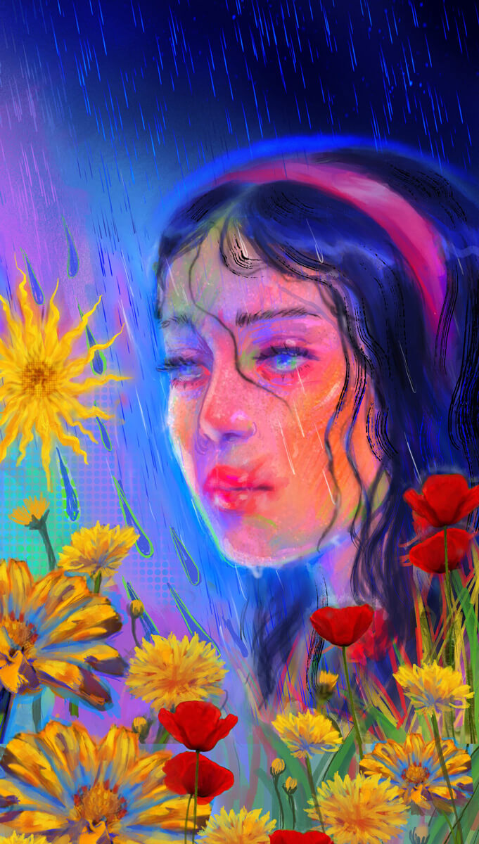 We were impressed by the contrast between the large amount of paint pouring down like rain and the girl in white with an umbrella. We think this is a wonderful work of original ideas sublimated into a work of art.