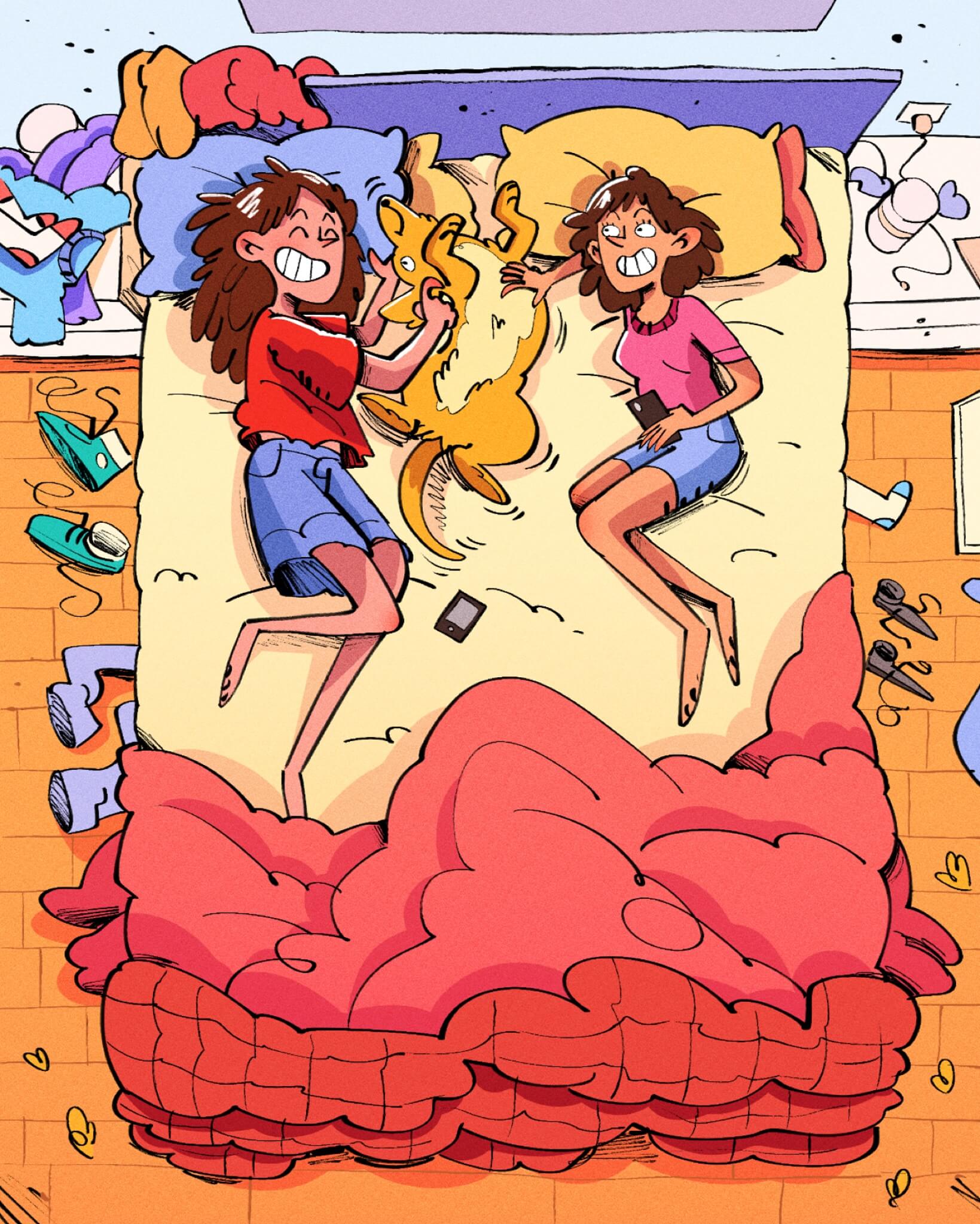 The bright and happy mood of this illustration is wonderful. How nice it is to spend time like this, lying down with pets and laughing over pleasant conversation.