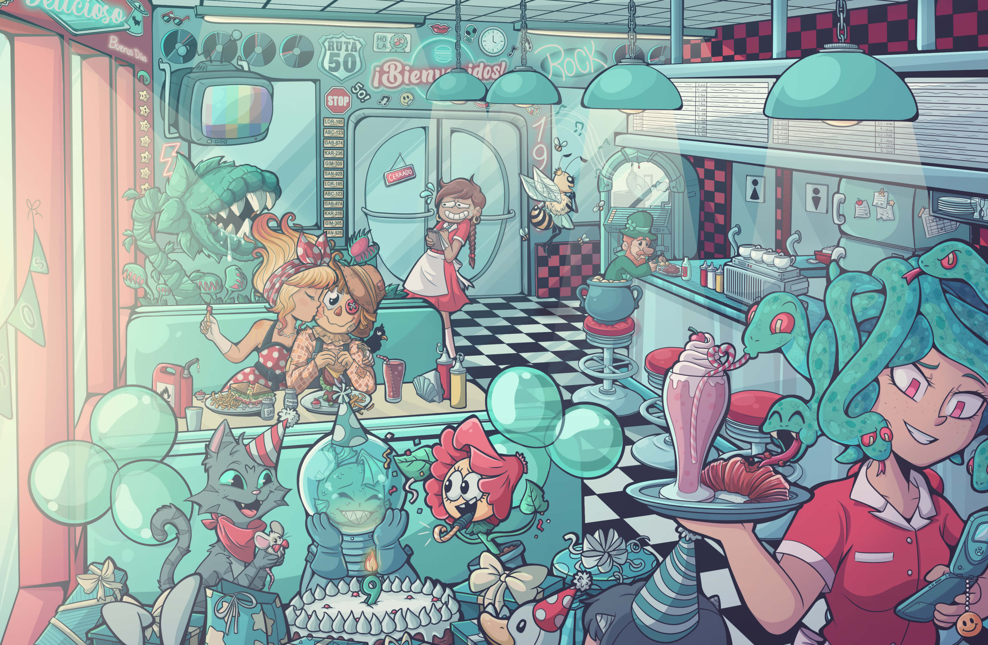 The illustration is nicely composed and each character is unique, making it fun to take a closer look at them. We would love to visit this restaurant.