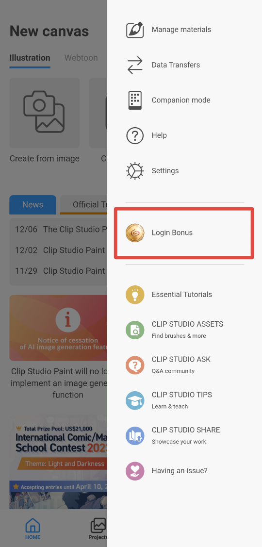 2. Tap Login Bonus and log in to your Clip Studio account.