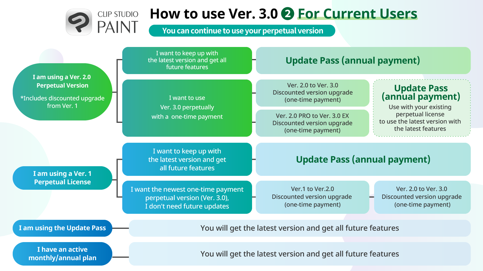 - We recommend that Ver. 1 perpetual license users buy the Update Pass (annual) to access the latest versions at a lower price. It is not possible to upgrade directly from Ver. 1 to Ver. 3.0 (perpetual version, one-time payment), so either purchase the Update Pass or purchase the Ver. 1 > Ver. 2.0 discounted upgrade and then the Ver. 2.0 > Ver. 3.0 discounted upgrade to get Ver. 3.0.