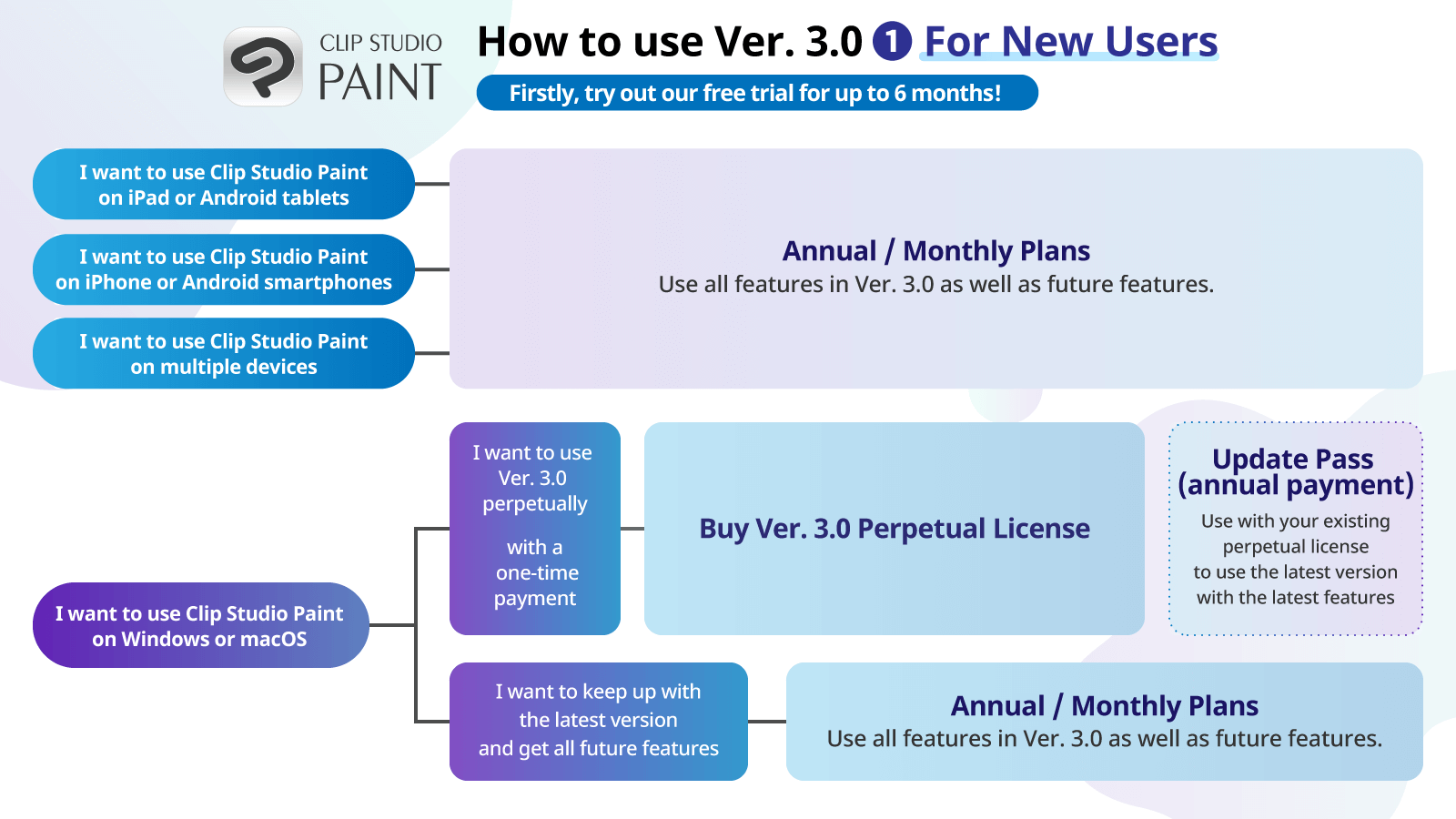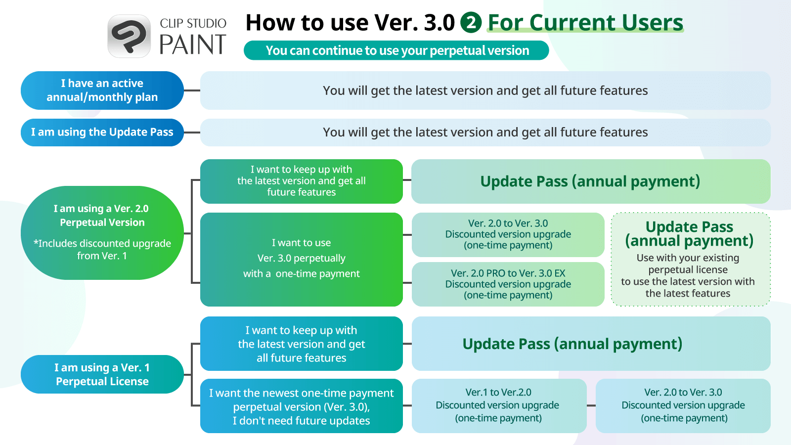 Current monthly/annual plan users and Update Pass users can update to Ver. 3.0 today. Users with perpetual licenses (Windows/macOS) for Ver. 2.0 or earlier can purchase an Update Pass add-on or get a discounted upgrade to Ver. 3.0.
